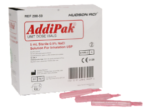 Each box of Addipak Saline is filled with 100 – 5ml vials filled with 0.9% Sodium chloride saline solution. Each unit dose of saline has an inverted milliliter graduation on the vial for accurate dispensing. Hudson RCI Unit Dose Saline vials are color coded and ready to use. This unit dose saline is preservative-free and contains no bacteriostatic agents or buffers. Sterile.